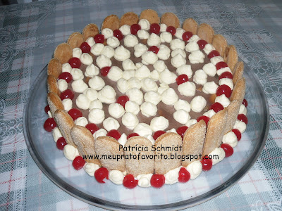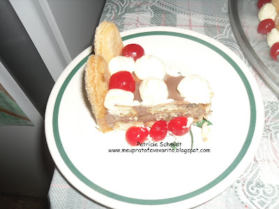 Pique o biscoito restante e faça uma camada de biscoito, creme, biscoito e creme.