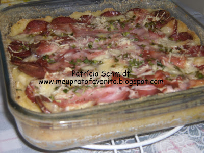 Fatias de linguiça, queijo mussarela e presunto picados, queijo ralado e salsinha picada.