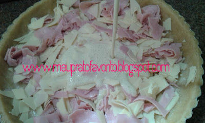 Numa forma untada e enfarinhada coloque metade da massa, espalhe o recheio e cubra com o restante da massa.